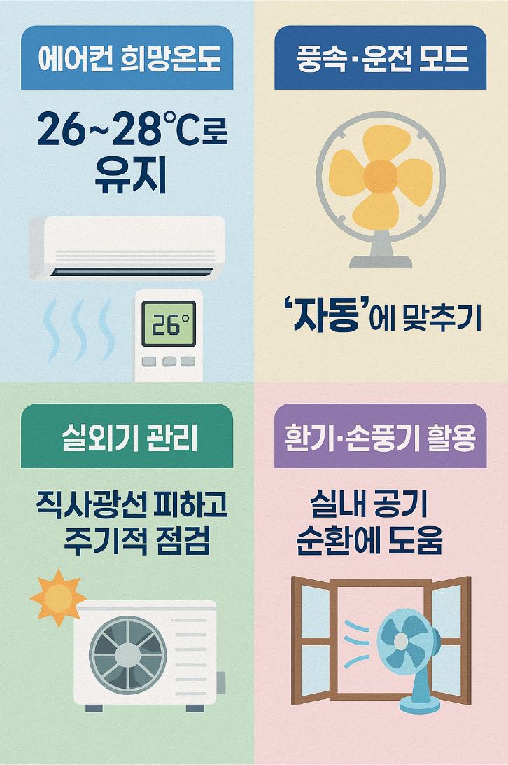 에어컨 설정만 바꿔도 전기요금이 확 줄어요! 희망온도, 풍속, 실외기 위치 등 냉방비 아끼는 현실 꿀팁 5가지를 정리했습니다.