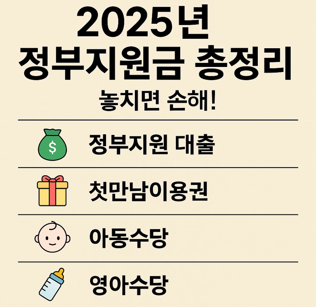 2025년 정부지원금 한눈에 정리! 무이자 대출, 첫만남이용권, 아동수당, 출산지원금 등 주요 혜택과 신청 방법을 이 글 하나로 확인하세요. 청년·서민·소상공인 필독 정보!