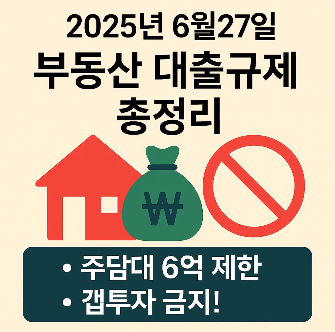 2025년 6월27일 발표된 정부의 부동산 대출규제 대책을 총정리했습니다. 주담대 6억 제한, 갭투자 금지, 실거주 의무화 등 부동산 시장에 큰 영향을 줄 주요 내용을 확인해보세요.