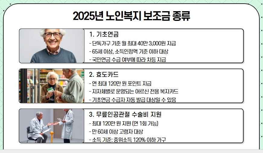 #노인복지보조금 #2025보조금신청 #기초연금신청 #효도카드신청 #무릎수술비지원 #에너지바우처 #노인일자리