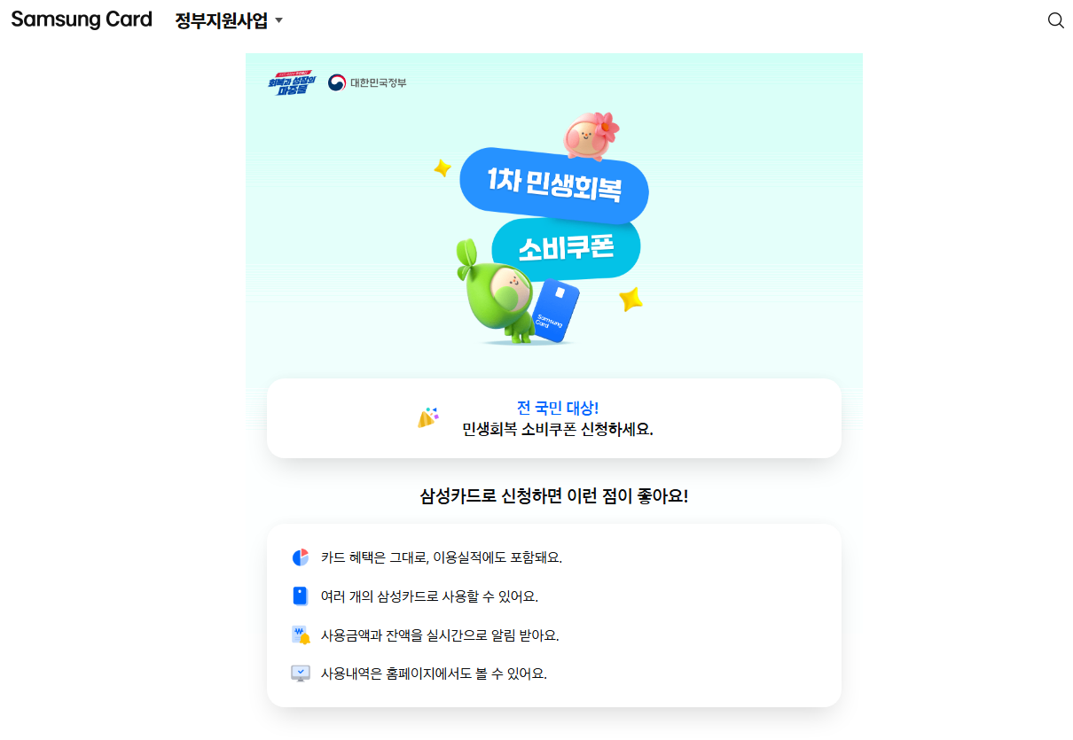 - 지원 대상 여부 확인 후, 신청 버튼을 누르면 자동으로 연결된 카드에 지급됩니다.