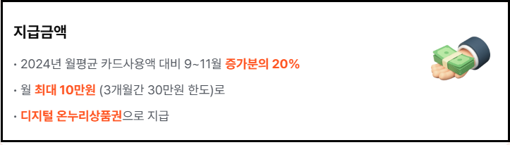 - 지급 금액: 9~11월 카드 사용 증가분의 20%, 월 최대 10만원, 3개월 최대 30만원