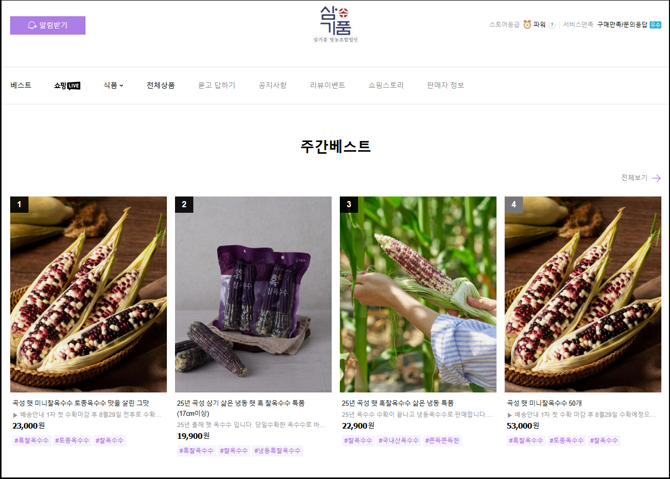 삼기품 흑 찰옥수수는 시즌별로 가격이 다소 변동될 수 있습니다. 네이버 스마트스토어에서 판매되고 있습니다.