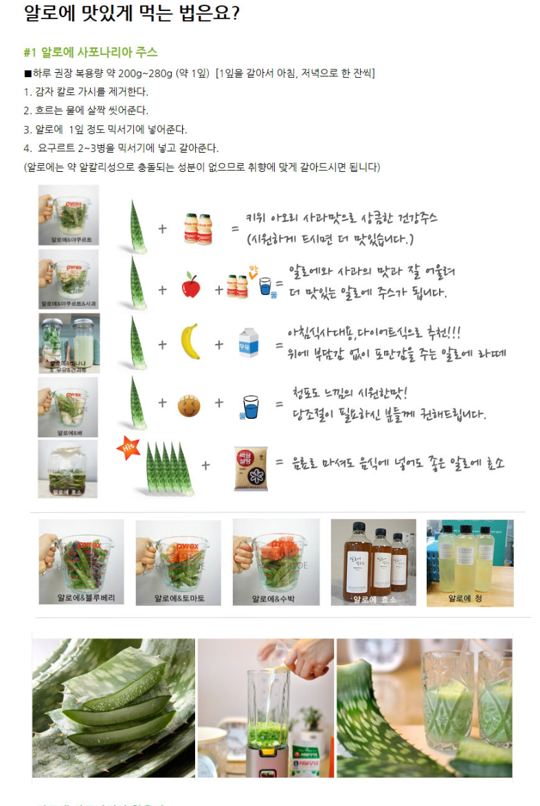 - 알로에는 생즙으로 바로 섭취하거나 가공 제품으로 섭취할 수 있으며, 꾸준히 드시면 건강 관리에 도움이 됩니다.