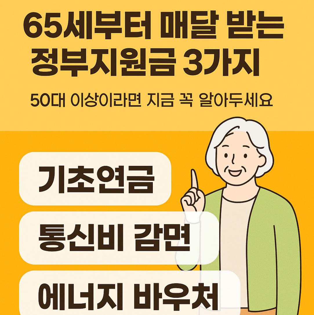65세부터 매달 받을 수 있는 정부지원금 3가지! 기초연금, 통신비 감면, 에너지바우처 신청 조건과 혜택을 쉽게 정리했습니다.